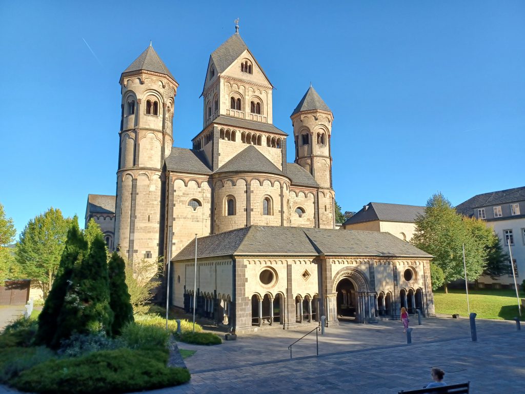 We besluiten de Rundweg langs de westzijde te starten in de richting van de abdij en kloosterkerk van Maria Laach. Het loont de moeite om de indrukwekkende Romaanse kerk van de paters benedictijnen van nabij te gaan bekijken. Bij het binnengaan worden je zonden door een in de voorhal – bijgenaamd ‘Das Paradies’ – gebeeldhouwd duiveltje opgeschreven! De kerk is in 1156 ingewijd; de voorhal werd in 1230 gebouwd. Aanvankelijk was het een benedictijner abdij, maar in 1802 werd het klooster door de Fransen van Napoleon opgeheven. Vervolgens namen paters jezuïeten het klooster weer in gebruik. Maar in 1892 ging de abdij weer terug naar de benedictijnen.