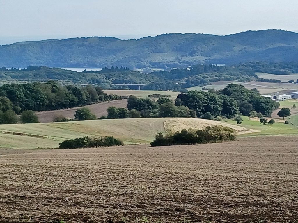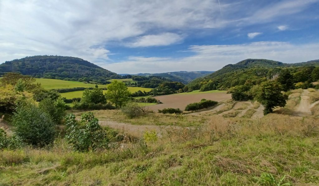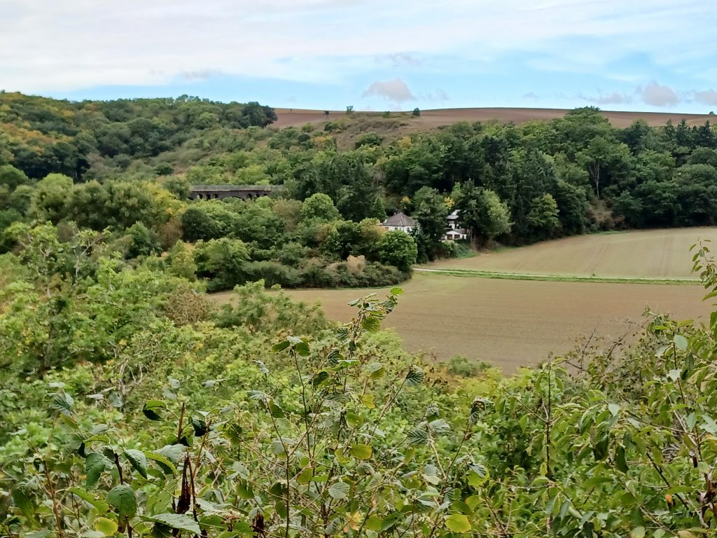 Vanaf de Matthiaskapel wandel je het zwaar beboste dal van de ‘Hohensteinsbach’ in. Een prachtig pad, dat echter op een gegeven moment een ‘U-turn’ maakt om vervolgens, aan de andere kant van de beek, door het eikenbos steil omhoog te gaan naar het uitzichtpunt ‘Rosenberg’. Opnieuw een fraai uitzicht op het Moezeldal bij Kobern-Gondorf! Na een inspannende klim bereik je de hoogvlakte. Hier volgt de Moselsteig enige tijd een route door glooiend akkerland. Prima om even bij te komen van het klimmen zojuist. In de verte zien we al de indrukwekkende Moselbrücke in de Autobahn 61. De vermoeienissen zijn echter nog niet voorbij!