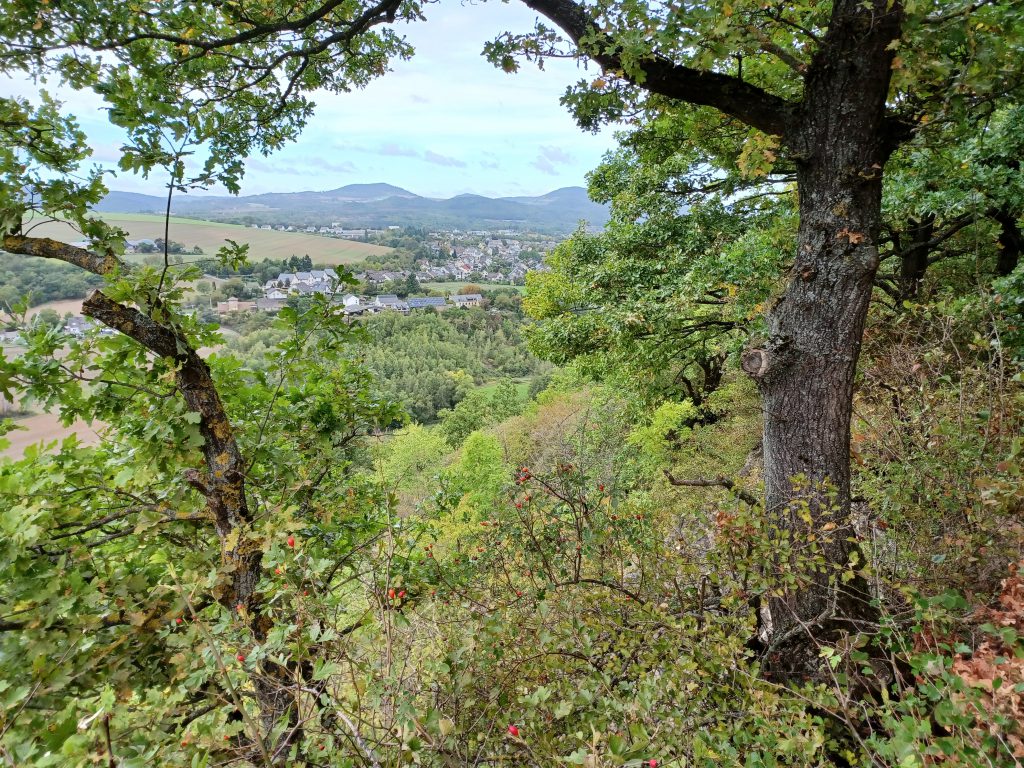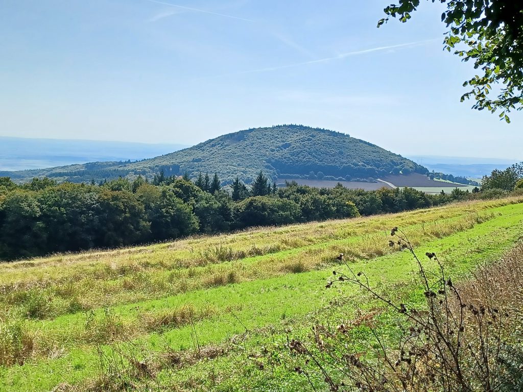 Het uitzicht vanaf de op de Sulzbusch gelegen Schutzhütte op het zwaar beboste dal van het riviertje de Nette valt wat tegen door struikgewas. Even snoeien, zouden wij zeggen! Later zie je, in de afdaling van de Sulzbusch, opnieuw de Hochstein-vulkaan voor je opdoemen. Na het oversteken van een autoweg met in de wegrand zwarte ‘zandgrotten’ – naar het schijnt gegraven schuilplaatsen uit de Tweede Wereldoorlog – begint verreweg de zwaarste klim van vandaag, de beklimming van de Hochstein. Zeker voor mensen van mijn leeftijd een uitdaging met veel hijgen en stilstaan! Maar je wordt beloond met een fantastisch uitzicht op het omringende gebied van de Vulkaneifel.