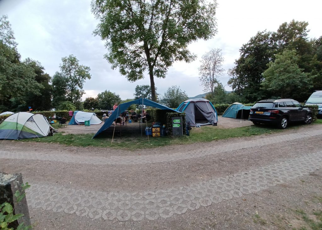 Als verblijfplaats kozen wij voor de aan de Laacher See gelegen RCN Camping Laacher See. Voor ons doen een luxe camping met zelfs een restaurant, het ‘Blockhaus’. Geen leuke weitjes, maar een typische ‘heggetjes-straatjescamping’ met veel caravans en campers. Wij reserveerden voor onze vier kleine tentjes twee plekken naast elkaar, mét redelijk zicht op de Laacher See. Per plaats is één auto toegestaan. Andere auto’s dienen buiten de camping op het parkeerterrein voor dagrecreatie te worden geparkeerd (toch wel een eindje lopen als je, zoals wij, helemaal aan de andere kant van de langgerekte camping staat!). Drie euro per dag zou dat moeten kosten, maar toen wij er waren, was het gratis. Sowieso hadden we op onze kampeerplekken ruimte genoeg om ook nog een grote ‘tarp’ van stevig zeil en tentstokken neer te zetten, waar tien mannen in geval van regen droog zouden kunnen zitten.