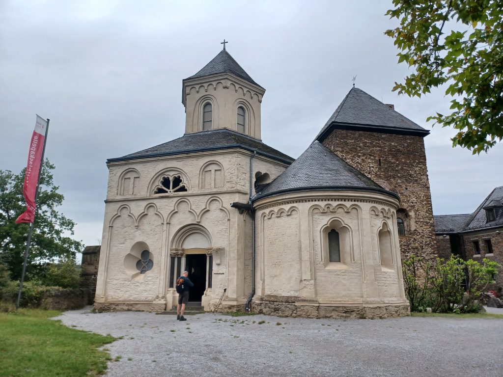 Opnieuw fraaie uitzichten op het Moezeldal, nu met de Niederburg erbij! De zeshoekige Matthiaskapel dateert van 800 jaar geleden en is gebouwd om het hoofdreliek van de apostel Mattheus te bewaren (maar dat relikwie wordt nu elders bewaard). Het is een van de belangrijkste laatromaanse kapellen in deze streek. Een bezoekje aan de rijk versierde kapel is zeker de moeite waard. Daarna kun je desgewenst gaan koffiedrinken in de Oberburg. Dit is dan, voorlopig, de laatste horeca-gelegenheid tijdens de 23e etappe van de Moselsteig! Pas bij de Raststätte bij de Moselbrücke in de A61 is een volgende gelegenheid. Maar dan ben je al niet ver meer van het einddoel Winningen.