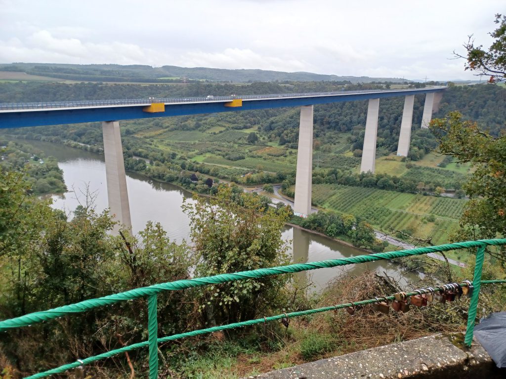 Na de klim blijft de Moselsteig op hoogte en slingert door het bos richting de steeds imposanter wordende Moselbrücke. Vlak vóór de brug vind je de Schutzhütte Blumslay met een schitterend uitzicht op de 935m lange brug in de Autobahn die hier, op 136m hoogte, de Moezel overspant. Een prachtige rustplek!