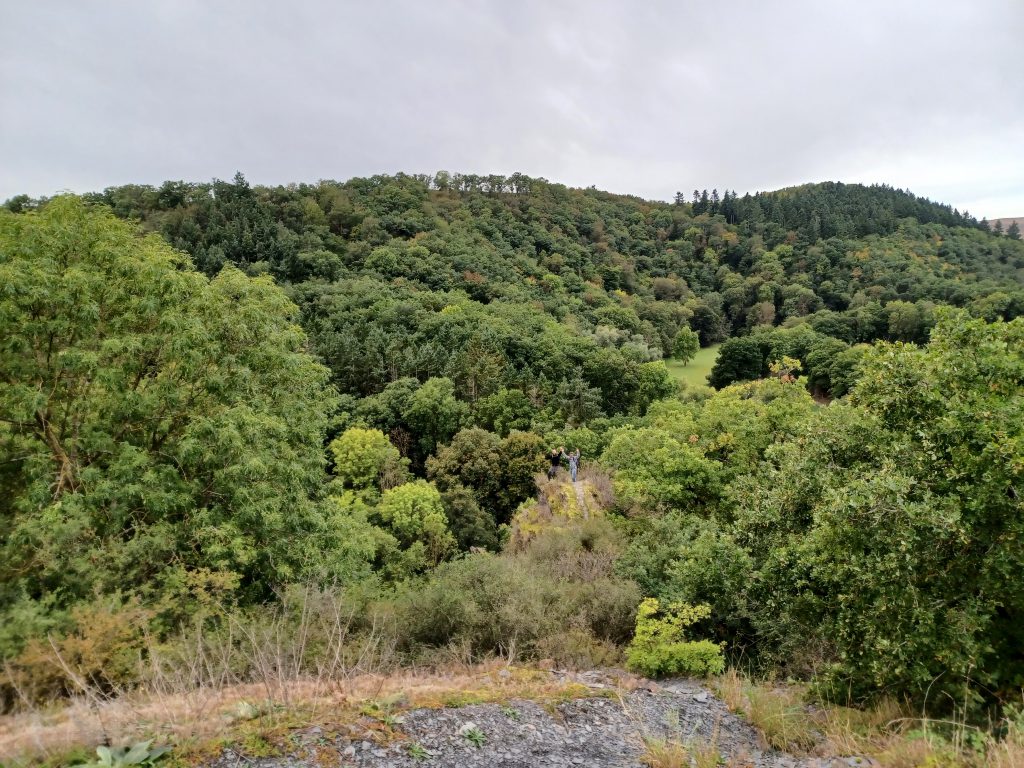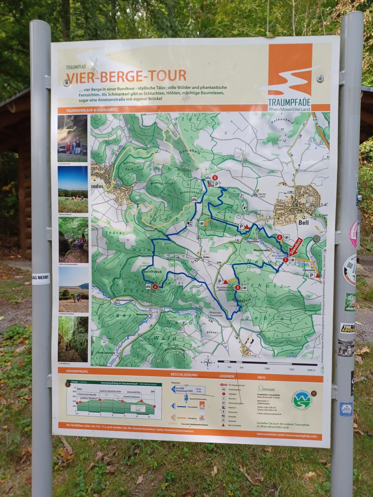 Je komt terecht in het zwaar beboste, rustieke ‘Belltal’, met daarin de ‘Belltalbach’, een zijbeek van de Moezel. Na een lange afdaling volgt opnieuw een forse klim, hier zelfs met een waarschuwingsbord aangekondigd: ‘Achtung! Steile Anstieg!’. En dat was niet overdreven, zeker niet voor een 73-jarige wandelaar!