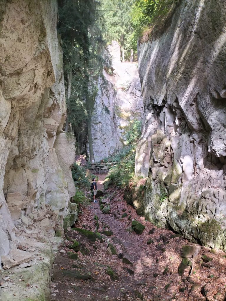 We lopen de route tegen de wijzers van de klok in, richting Gänsehals, en krijgen dan eerst het meest bosrijke gedeelte van de Tour voor de voeten. Onderweg passeer je na een tijdje de massieve tufsteenwanden van het rotsmassief ‘Rauhbuur’. Wij konden hier niet overal komen wegens gevaar voor vallende stenen! Verderop kon een uitstapje worden gemaakt naar de indrukwekkende rotskloof van de ‘Marxe-Lay’, een voormalige basaltgroeve van de familie Marx met twaalf meter hoge rotswanden.
