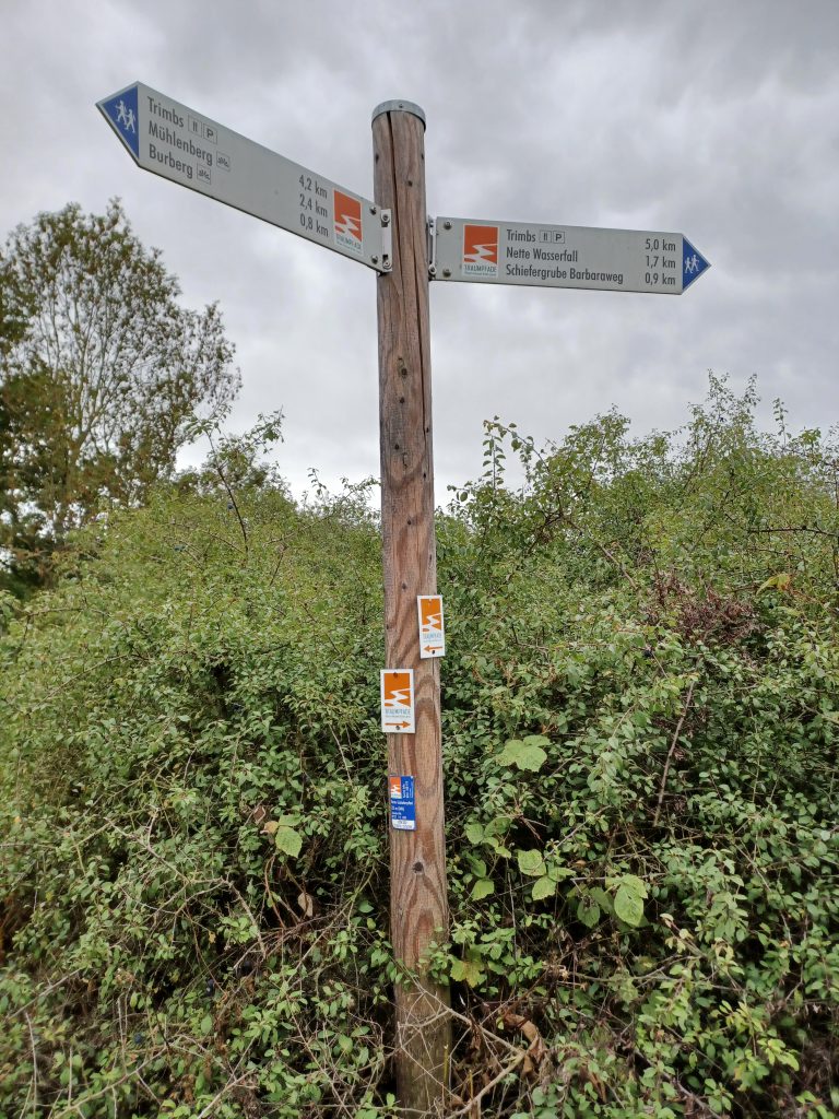De laatste dag hebben we niet zoveel tijd meer voor een slotwandeling, dus we besluiten de voorgenomen route over het Traumpfad Nette-Schieferpfad in te korten van 9,2 kilometer naar 6 kilometer. We lopen de ‘westelijke lus’ van het pad, gerekend vanuit het in de vallei van het riviertje de Nette gelegen dorp Trimbs. De auto’s kun je parkeren op het ‘Dorfplatz’ aan de Hauptstrasse bij de brug over de Nette.